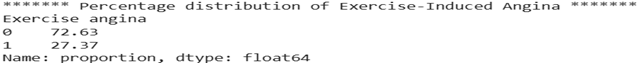 As shown in Figure 3, the dataset contains a higher proportion of non-exercise-induced angina (72.63%) compared to exercise-induced angina (27.37%).