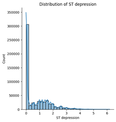 This moderate positive correlation suggests that greater ST depression is associated with changes in the slope of the ST segment. Clinically, this is expected, as both variables relate to ECG changes during exercise stress testing.