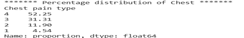 Based on the dataset shown in Figure 1, the most common type of chest pain is asymptomatic, accounting for 52.25% of cases. This is followed by non-anginal pain, accounting for 31.31% of reported cases.
